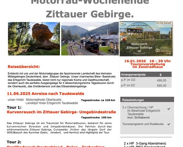 Entdeckt mit uns und der Motorradgruppe die faszinierende Landschaft des kleinsten Mittelgebirges Deutschland, dem Zittauer Gebirge. Unser charmantes Bikerhotel bietet sehr gute regionale Küche, einen Grillabend und ist perfekter Ausgangspunkt für alle unsere geplanten Touren.