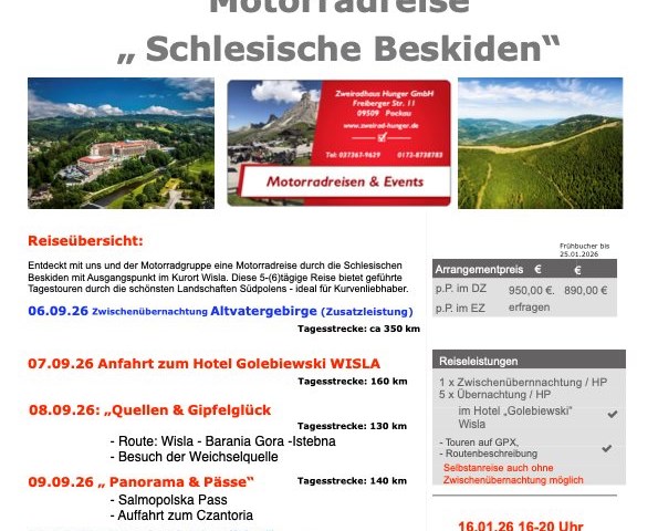 Die BESKIDEN sind ein Eldorado für Kurvenliebhaber, ein unbekannteres Reisezeit für Biker, eine ehemalige faszinierende Heimat für viele Vetriebene, deren Geschichten und Heimat ein Erlebnis wert sind.